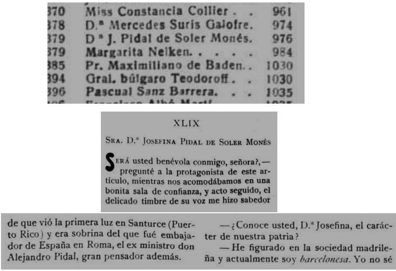 Amb tot he intentat què determinades entrades tinguin un cert grau d’incertesa, com és el cas de la Sra. Josefina Pidal de Soler Monés : la localitzem en una entrevista i una imatge d’ella, però que avui en dia no coneixem dels possibles descendents d’aquest matrimoni Soler-Pidal.