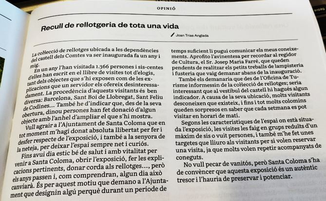 Ambdues manifestacions, i col-leccions tenen com a fil comú el rellotge, un element que forma part de la nostra vida i què, ara, amb les noves tecnologies, ha anat quedant relegat, però que ha estat important per a moltes generacions; no fa molt a pagés, i en indrets rurals, el temps s’acompasava amb les hores de sol i llum…