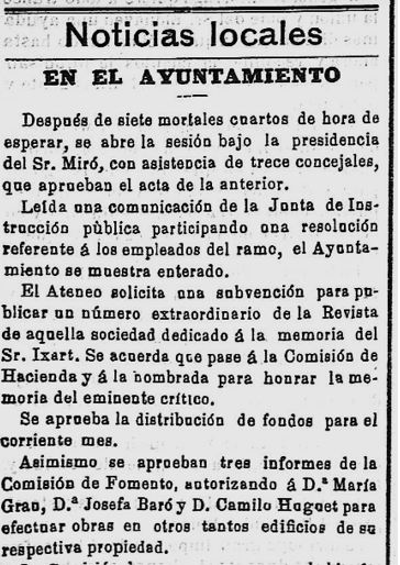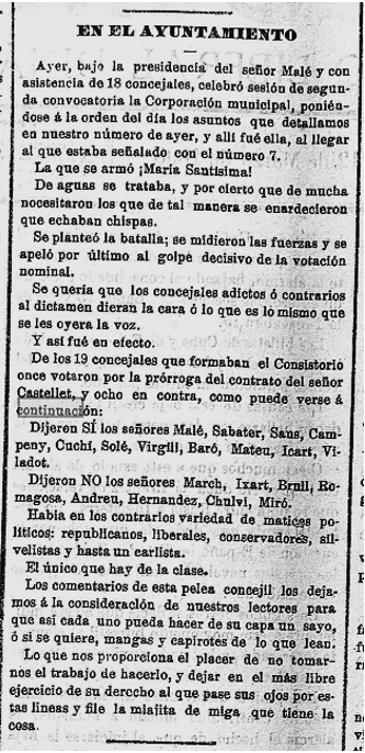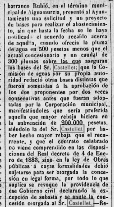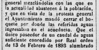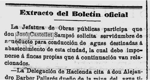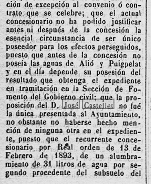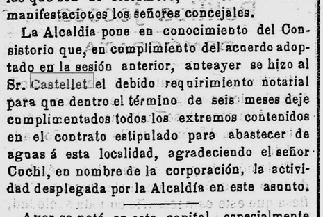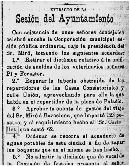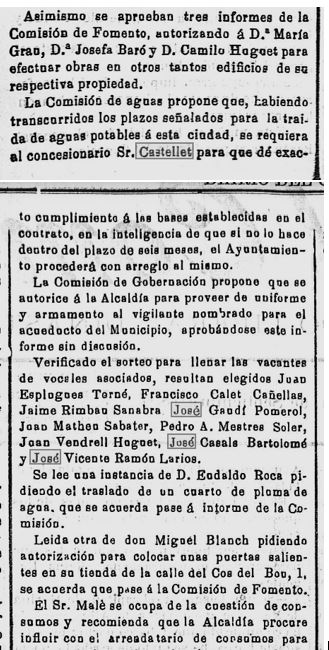 1897 – 4 de setembre : En el darrer Ple de l’Ajuntament, la “Comisión de Aguas” reclama al concesionari Josep Castellet, que superat el termini previst, informi sobre els compliments dels terminis i condicions de la concessió (Imatge 3).