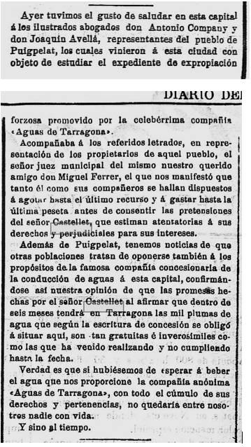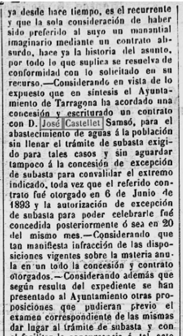 1895 . 24 de maig : Detall dels pleits incoats al “Tribunal Contencioso Administrativo”, un de l’Ajuntament de Tarragona, contra la Reial Ordre de 21 de gener 1895, sobre lalitat de la concessió signada amb el Sr. Josep Castellet Sampsó, i un altra d’aquest, com a gerent de la “Compañia Anónima Aguas de Tarragona”, al mateix afecte (Imatge 2).