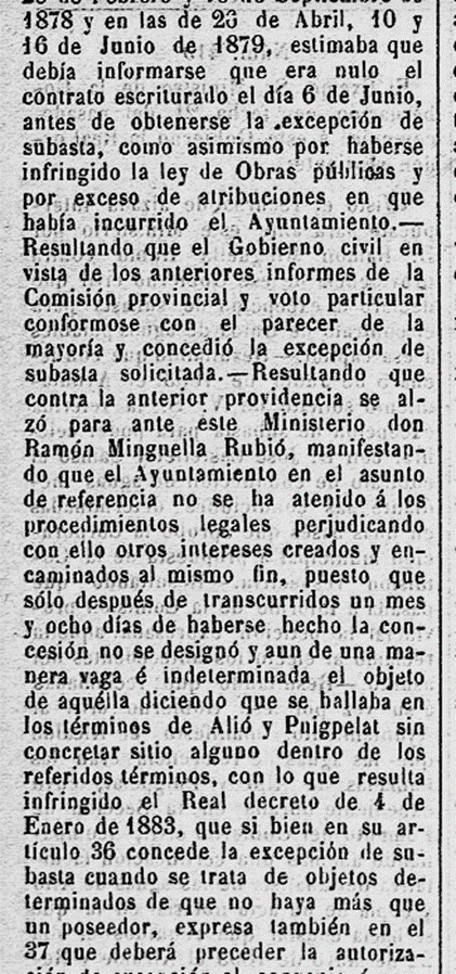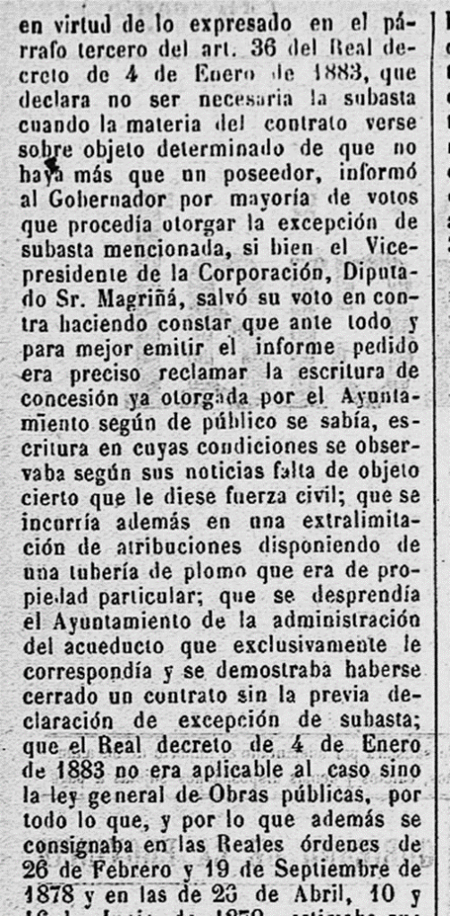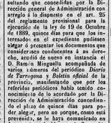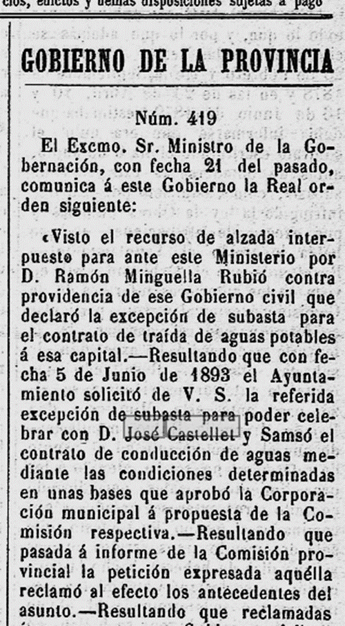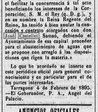 1895 – 5 de febrer : Publicat al BOPT, la “Real Orden” del Ministre de la Governació, de data 21 de gener 1895, per la qual ressolt el recurs interposat per en Raóon Minguella Rubió, en el sentit d’anular el contracte i la concessió de l’abastament d’aigües a Tarragona (Imatge 1).