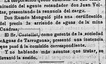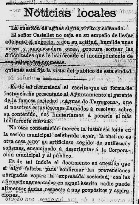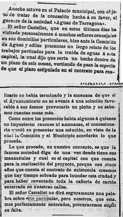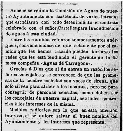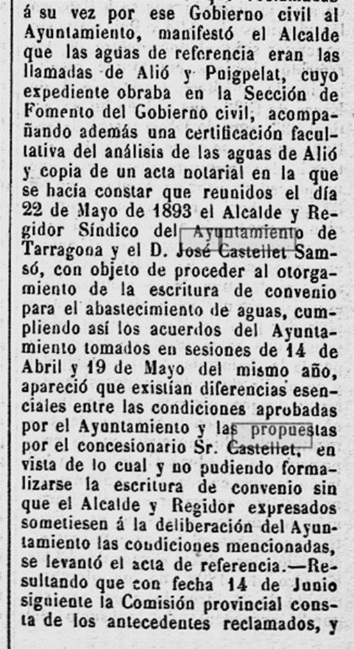 1893 – 5 de Juny : L’Ajuntament de Tarragona demana l’exempció del procediment de subasta, per a poder subscriure, amb el Sr. Josep Castellet Sampsó, el contracte per l’arribada d’aigua potable a Tarragona, d’acord amb les condicions i clausulat que s’havia aprovat (Imatge 1)