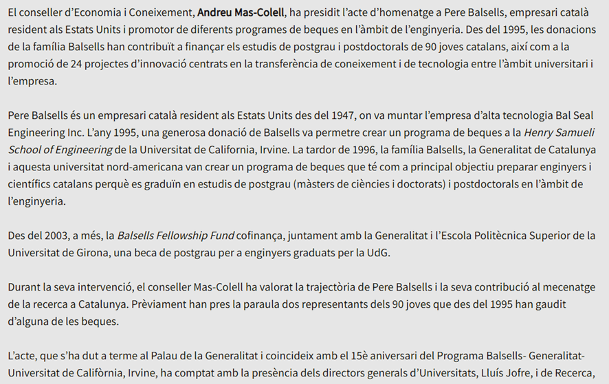 Part d’una ressenya sobre el reconeixement a la tasca d’en Pere Balsells, amb l’assistència del Conseller Mas-Colell
