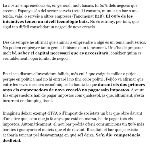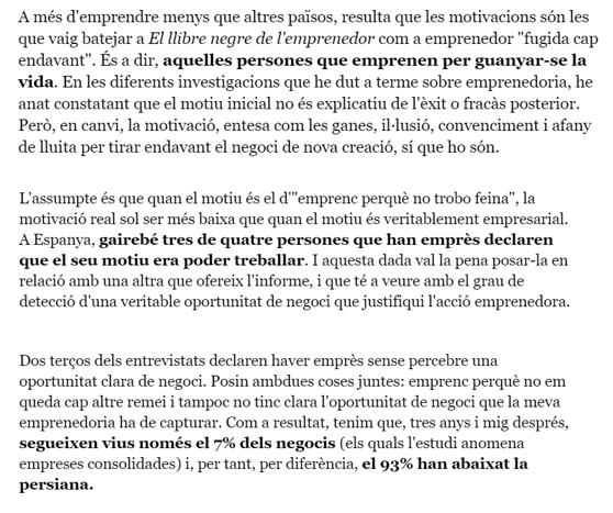 Ser emprenedor avui dia és molt complex, i només a l’abast de persones amb recursos “no vitals”; però l’emprenedoria continua essent llaminera, i es pot veure, des de fora, com un alliberament d’horaris, de preocupacions, i amb na inversió assumible d’euros et pots fer amb el traspás d’una botiga, d’un bar…