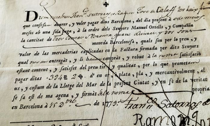 Any 1779 (fa 244 anys) Compromis de pagament a sis mesos entre els Senyors Francisco Sotorras? i Ramon Jove de Calaf, a l’ordre de Mnuel Ortells y Compañia. Text imprès en català