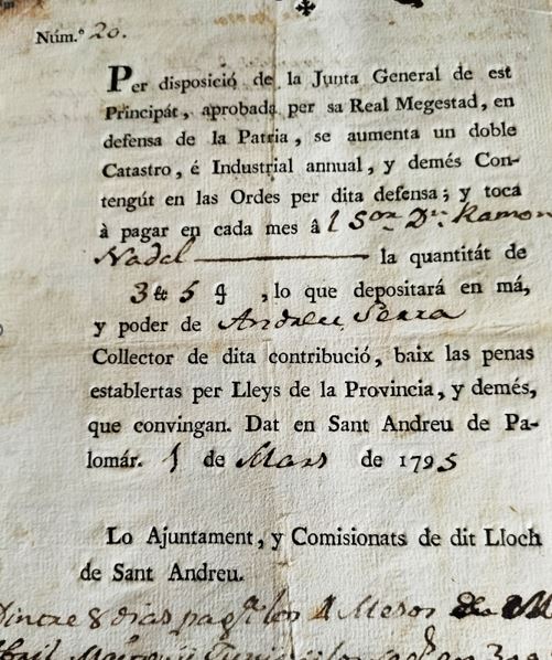 Any 1795 (fa 228 anys) Notificació doble cadastre per la guerra del Rosselló (1793-1795). Text imprès en catalá