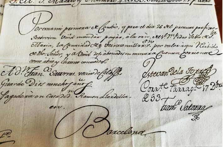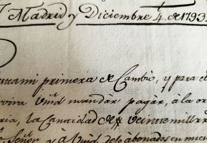 Any 1793 (fa 230 anys) Document manuscrit del 4 de desembre de 1793, en format lletra de canvi. de 20.000 reals de velló, a pagar en la casa de Ramon Rordella a Barcelona