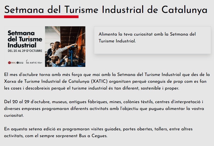 Un ventall de propostes representatives i arrelades a l’indret on varen sorgir : fàbriques, mines, farineres, bodegues… un mun de possibilitats per a recrear el ric patrimoni industrial, d’apropar i fer conèixer a les noves generacions, com era la vida generacions enrere.