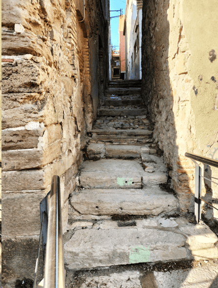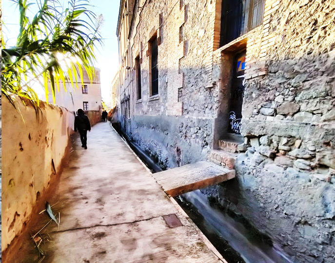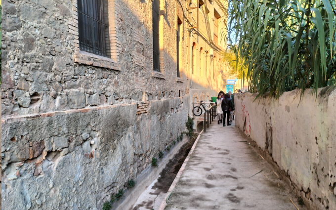 Carrerons, passadissos, patis interiors, el rec al costat dels vianants, i l’estructura i columnes d’una arquitectura industrial, que val la pena veure…