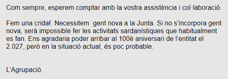 Aquesta es la crida real d’una entitat què, amb motiu de la convocatòria ordinaria de socis, ens acompanya aquest paràgraf què parla d’una realitat i comparteix un neguit, envers la viabilitat dels objectius socials.