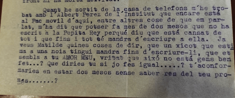 Continua la carta amb un paràgraf, on demana li escrigui, quan tingui noticies del tiet “Papitu”, que es troba lluitant al Front del Segre, i rep noticies que el deixen intranquil; explica que, sortint de la casa de telèfons ,(devia ser la centraleta), s’ha trobat amb l’Albert Pérez (company de l’Institut), i ara al Parc Mòbil, i li ha comentat que fa dos mesos que no li ha escrit a la Pepita Rey, la seva promesa, adduint que esta cansat de tot, i té mandra d’escriure-li… i s’estranya i fa comparança a veure que li semblaria si estigues dos mesos sense saber-ne res.