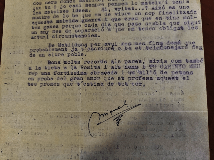 En aquests tres primers paràgrafs, escrits amb un llenguatge d’enamorats, es denota la incertesa d’en Miquel ja que, just abans, havia pogut parlar amb ella (Matilde), per telèfon, i esta esperant que els vinguin a buscar per marxar cap a un altra lloc.