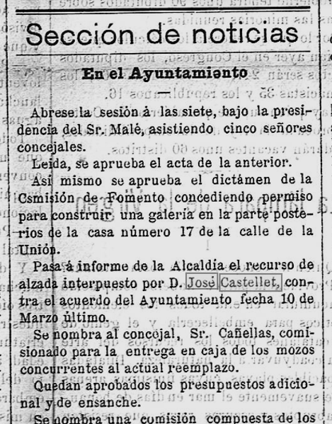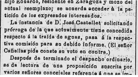 1899 – Abril : Pasa a estudi de l’Alcaldia un recurs interposat per el Sr. Josep Castellet, sobre l’acord de l’Ajuntament del 10 de març passat (Imatge 6).