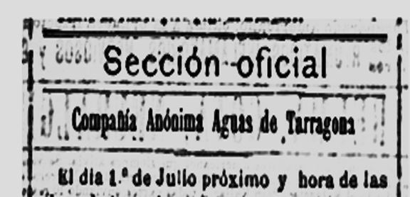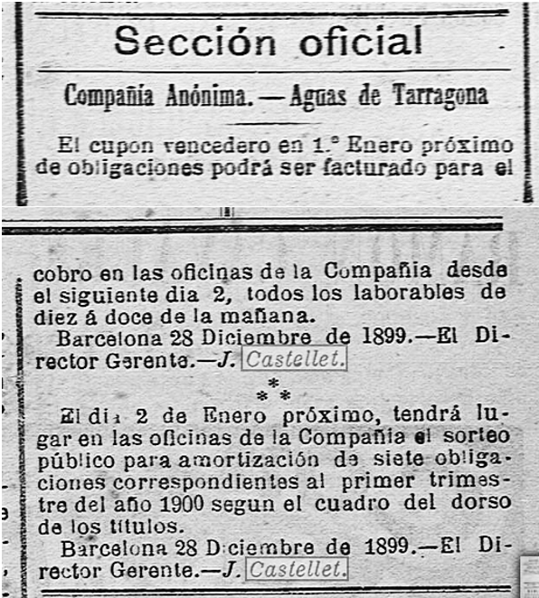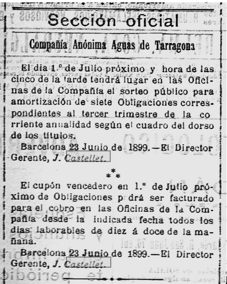 1899 – Juny : Apareixen anuncis oficials sobre amortització d’Obligacions i pagaments dels cupons de la “Compañia Anónima Aguas de Tarragona” (Imatge 7) i (Imatge 9) del semestre següent.
