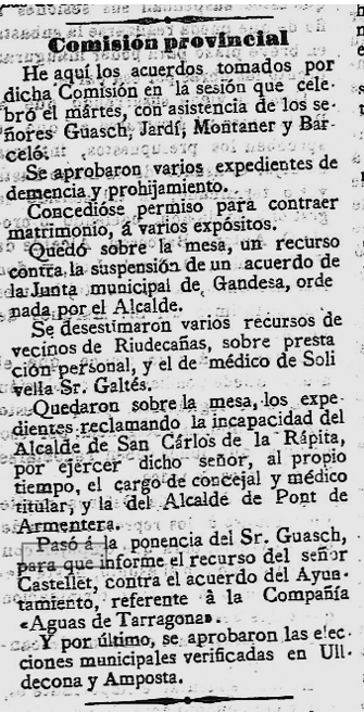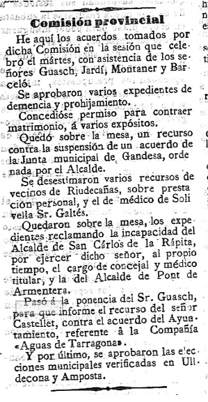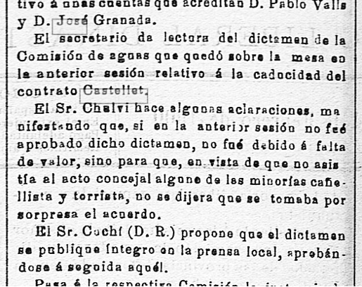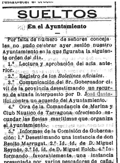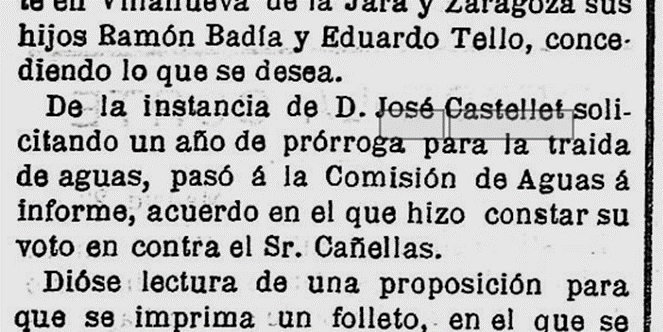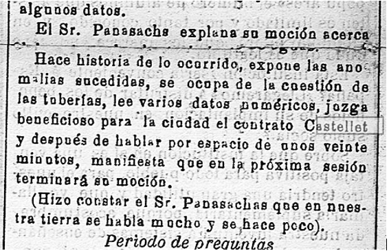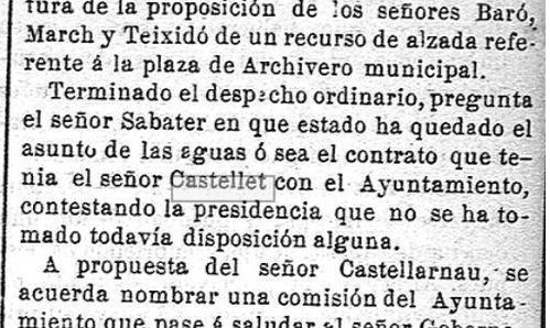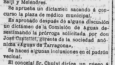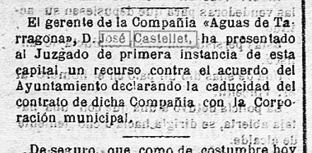 En aquest periode, els diaris publiquen els recursos i desacords entre la “Compañia Anónima de Aguas Tarragona” representada per el seu gerent Sr. Josep. Castellet, i l’Ajuntament