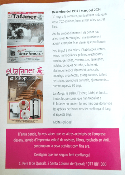 Amb aquest número. corresponen a la segona quinzena de març, ha deixat d’editar-se aquest recull gratuït d’informacions en paper què, cada 15 dies, ens donava a conèixer moltes de les festes majors de la nostra comarca, i a la vegada petits anuncis immobiliaris, de serveis, o publicitat que ens ajudaven a conèixer l’oferta comercial o de serveis del nostre entorn.