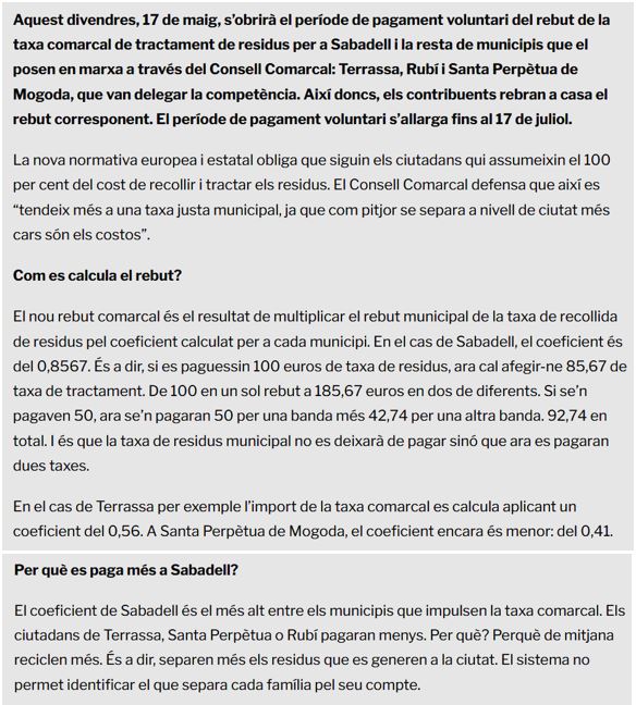 L’adopció d’una Taxa Comarcal, per al tractament dels residus locals (com en alguns municipis del Vallès Occidental) intenta, mitjançant una penalització econòmica, traslladar el cost del tractament d’aquestes deixalles domèstiques, al contribuent.