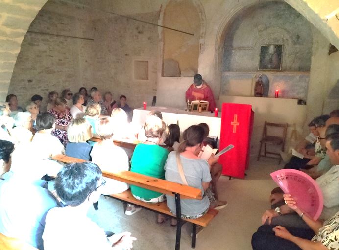 L’església es fa petita per la missa de Mossèn Otaba : uns la podrem seguir des de la porta i, d’altres, als bancs i cadires què, ordenadament, acullen a la prop d’una setantena d’assistents totals; crec que l’Aplec hauria de retornar a la missa a l’aire lliure deixant l’església, oberta, per al recolliment i visita, especialment per un espai on, les limitacions de mobilitat d’una part dels assistents, no han estat contemplades (carrer d’accés, esglaons de baixada a l’interior de l’església, accés al mirador, suposats esglaons, manca d’il·luminació interior..).