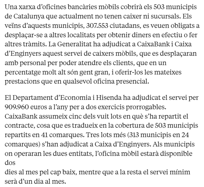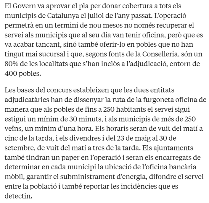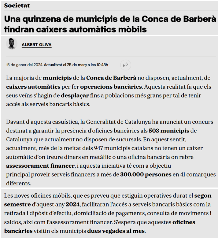 Ressenya parcial; informació publicada a “https://www.lavanguardia.com/encatala/20240220/9524097/els-503-pobles-sense-banc-tindran-sucursal-mobil-abans-desembre.html”