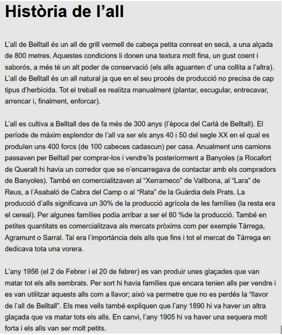 Aquest indret de la Conca de Barberá, al peu de la carretera C-14, entre Montblanc i Tárrega, ha recuperat la varietat d’all què, històricament, havia estat cultivat en aquest municipi.