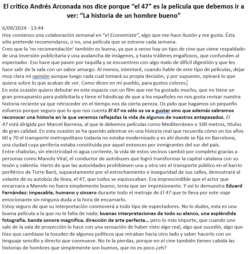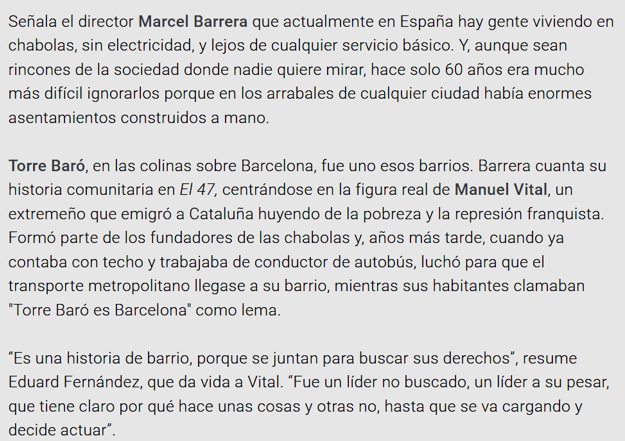 El “47” es una pel·lícula per veure, segurament, molt més apte per als espectadors que superem uns anys i podem apropar-nos a aquesta realitat viscuda però, també, un exemple per a les noves generacions, en el sentit de que la societat i el barri l’hem de fer entre tots, i mirant per tots…