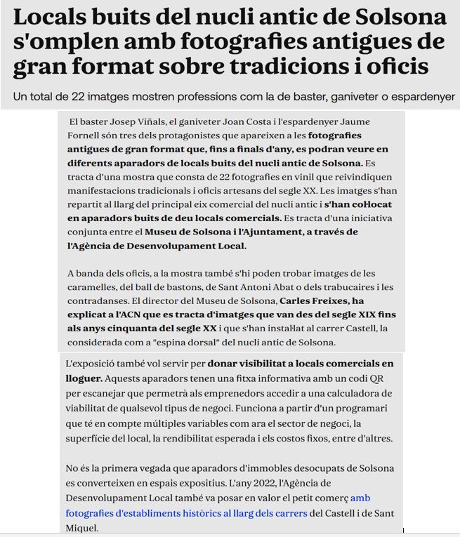Passejant, per el centre de Solsona he trobat què, en alguns locals comercials buits, els han cobert de fotografies sobre la història del municipi, de les seves tradicions i/o activitats, fet que que evita la degradació d’un espai privat, però visible a peu de carrer.
