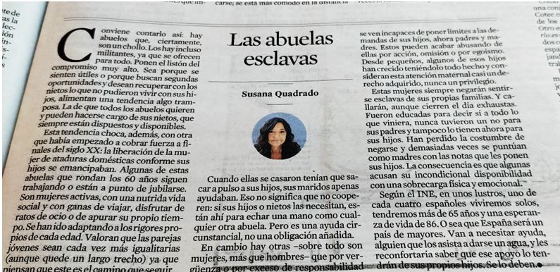 Ahir, la periodista Susana Quadrado, publicava a “La Vanguardia” la seva col.laboració amb el titol de “Las abuelas esclavas”, en referència a les avies, i avis actuals, que es veuen implicats en l’ajuda als fills, i nets, tant dedicant-hi temps, con en ajuts econòmics, amb motiu del “Dia Internacional de les Persones Grans”.