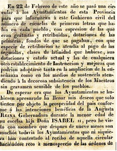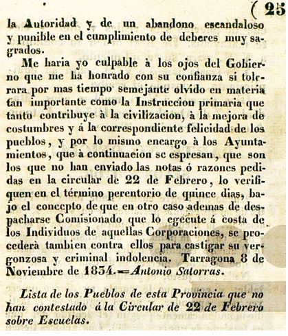 El 22 de febrer, del mateix any 1834, s’havia enviat als Ajuntaments una circular perquè informessin de les escoles que hi havia a cada poble indicant el seu manteniment i, de com s’atenia aquest servei..; es diu què, aquesta Circular, va ser adreçada als Ajuntaments (per mitjà del Butlletí Oficial) i al terme de Llorac s’esmenten, com a entitats que no han contestat aquest requeriment, els cinc indrets que formen l’actual municipi.