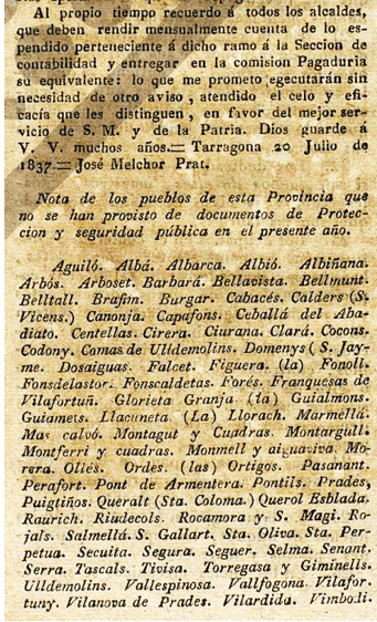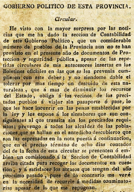 Una Circular del “Gobierno Politico de esta Provincia”, insta als Ajuntaments a demanar els “documentos de protección y seguridad publica…”, en part per la pèrdua d’ingressos públics i. per l’altra de no poder oferir als seus veïns, els passaports i pases, per poder viatjar, i de donar coneixement dels documents expedits.