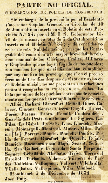 En aquest Butlletí, la “Subdelegación de Policia de Montblanch”, demana la relació de “Clérigos, Frailes, Militares y Empleados que se han fugado…” i, entre els indrets que no han contestat a aquest requeriment, hi ha els cinc indrets del terme de Llorac.