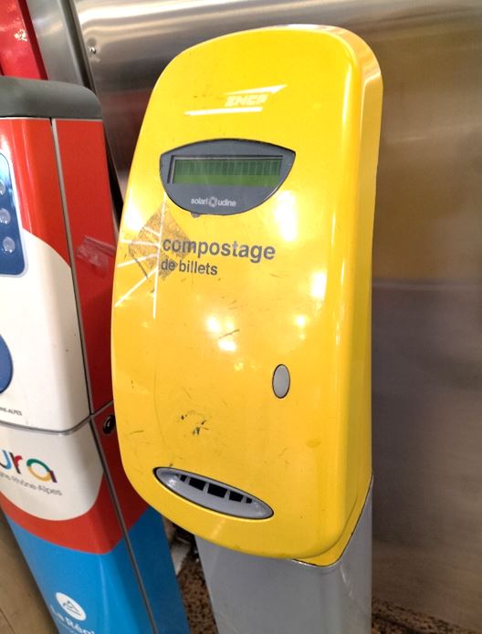 Fa uns mesos, en un desplaçament a Lyon vaig veure què, a l’espai de sortida de passatgers (a l’estació de tren) hi havia una aparell (que reprodueixo), on es podien reciclar els bitllets de transport (compostage des bitllets); és un element que està estratègicament ubicat i, encara que no hi estiguem habituats, ens recorda aquesta possibilitat.
