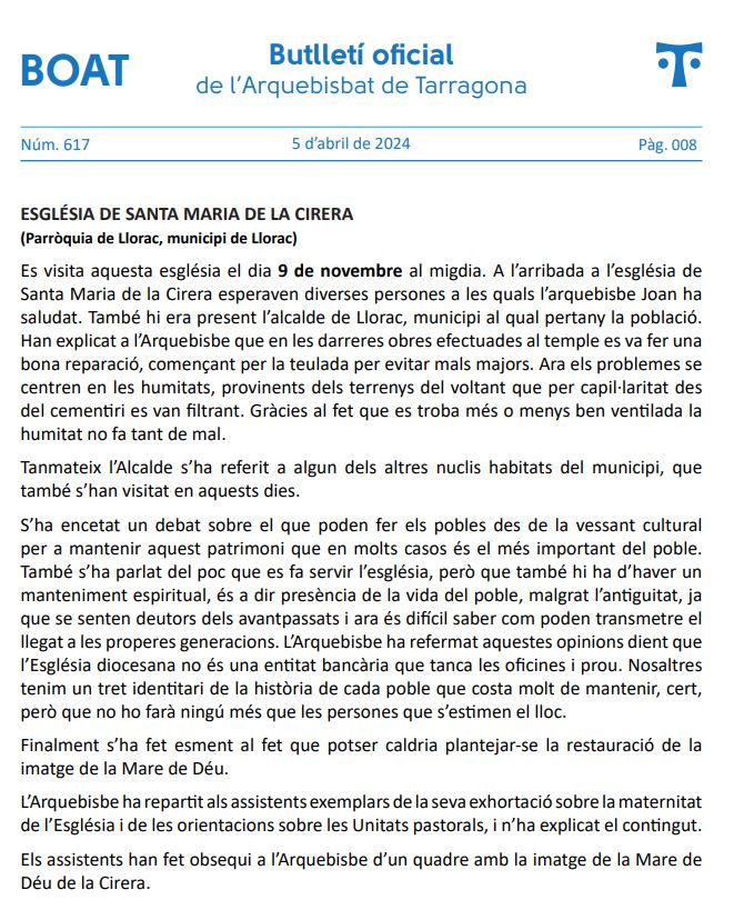 Resum de la visita de l’Arquebisbe, publicada al BOAT