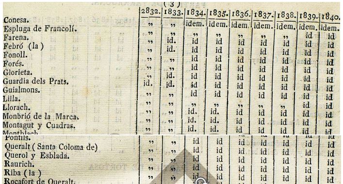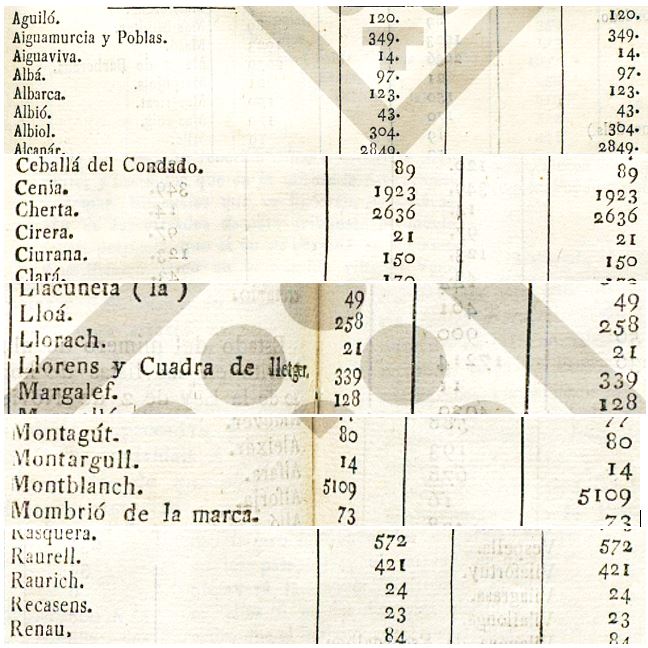 En aquest Butlletí hi trobem el llistat de pobles e indrets de la Provincia, amb “el estado del numero de almas de cada municipio…”, amb la valoració de cada un dels indrets del municipi de Llorac.