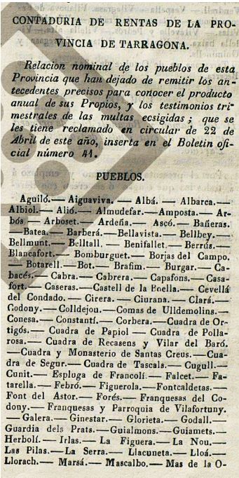 En el Butlletí d’aquesta data, es fa esment dels pobles que “…han dejado de remitir los antecedentes precisos para conocer el producto anual de sus Propios, y los testimonios trimestrales de las multas exigidas…”. Hi figures els indrets de (La) Cirera, Llorac, Montargull i Rauric