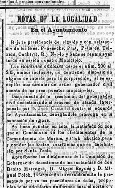 Amb data 31 d’agost l’Ajuntament de Tarragona es reuneix en sessió i, entre d’altres acords adoptats, es comenta la resolució del Governador Civil, desestimant el recurs presentat per el Sr. Castellet, contra l’acord del Consistori, en el qual s’havia acordat denegar la pròrroga de la concessió del servei d’aigües (Imatge 1)