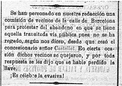 El 13 de setembre 1900, el mitjá “La Justicia”, es fa ressò del malestar d’un grup de veïns, del carrer Barcelona, que s’havien presentat a la redacció, fent constar la deixadesa en el rec i/o neteja de l’esmentat carrer, “…no se ha regado…desde que cesó el concesionario Sr. Castellet” (Imatge 2).