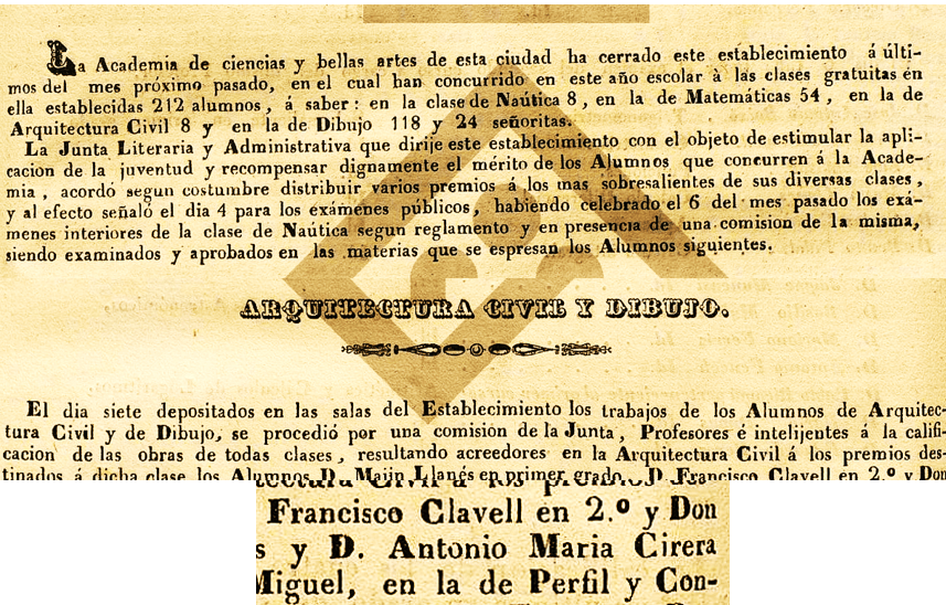 En aquesta edició del Bulletí, hi surt el nom de “Antonio Maria Cirera”, com a alumne de l’Academia de Ciencias i Bellas Artes de Tarragona”, com a reconeixement i premi als seus estudis