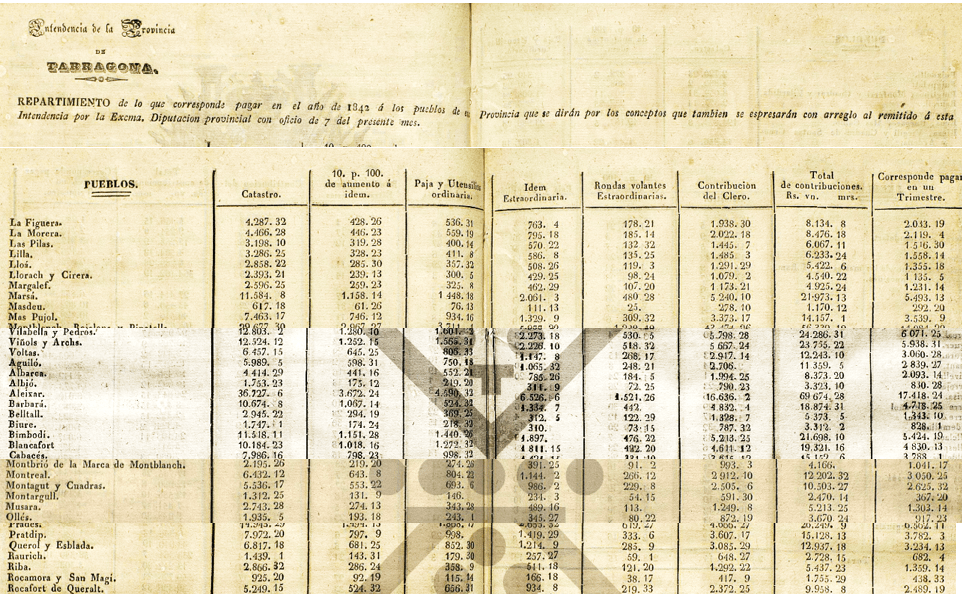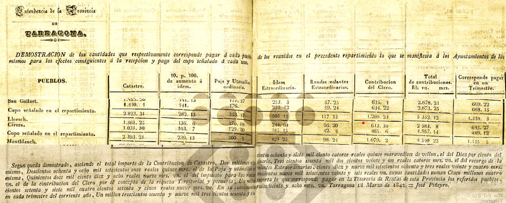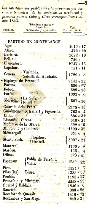 Detall quantificat poble a poble sobte la Contribució de “Culto y Clero”; a l’ordre hi ha el detall dels municipis i dels imports assignats. Llorac i La Cirera ja venen agregats.