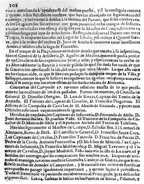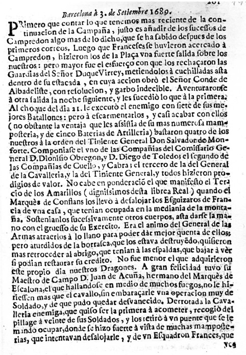 Hi ha, a les pàgines 11 i 12 del document, referència als combats a la frontera francesa, prop de Campredon (Camprodón ?), i es diu textualment “… de un cavallero de sus experiencias brios y zelo, i especialmente la noche de 25 hizo adelantar la Bateria a tiro de pistola : lo qual sin duda fue causa de que la guarnición apresurase la ida, del modo que tenia ideado. Lo que asta ahora no haviamos oido, es que se llevo en pedaços la campana mayor de la Vila, y la saqueó, menos lo que se hallava recogido en las iglesias; templança maravillosa si se coteja con los otros estilos de sus barbaridades de Alemania…”.