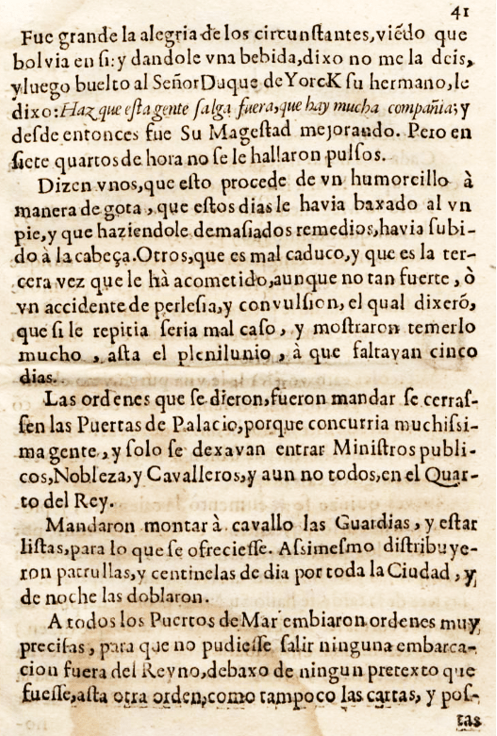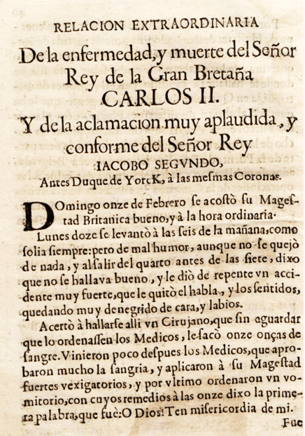 Aquesta publicació recull informacions diverses, recopilades de correspondència i altres mitjans, sobre noticies d’arreu: com diu en la pàgina primera, hi ha aquest article que diu “Adjunta va la relacion extraordinaria de la enfermedad, y muerte del Señor Rey de la Gran Bretaña”. És un relat dur d’una malaltia que els metges de l’època no coneixien, però els simptomes eren clars “…y al salir del cuarto antes de las siete, dixo que no se hallava bueno, y le dió de repente un accidente muy fuerte, que le quitó el habla, quedando muy denegrido de cara, y labios.”