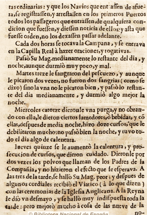 mes endavant diu :”…Cada dos horas se tocava la Campana, y fe entrava en la Capilla Real a hazer oraciones y rogativas…Passo su Mag. Medianamente lo restante del día, y noche, aunque durmió muy poco y mal…”