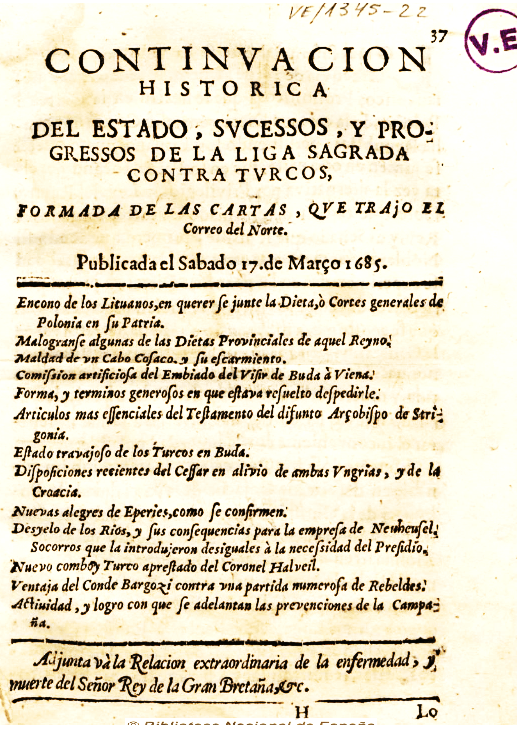 Document 1 : “”Continuacion Historica del estado, sucessos, y progressos de la liga sagrada contra turcos – 17 março 1685”