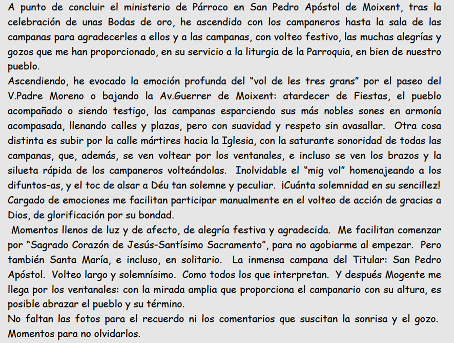 Un acte simbòlic, d’agraiment i de compartir, amb els campaners de Moixent aquests darrers moments, després de 21 anys de permanència de Mossèn Antonio González (a la Parròquia de Sant Pere Apòstol) una amistat i una relació personal que perviurà en el temps, i que ha aprofitat com un acte més de despedida, per pujar al campanar, i voltejar les campanes, que l’han acompanyat festes i actes religiosos, i ha acabat amb un àpat conjunt.