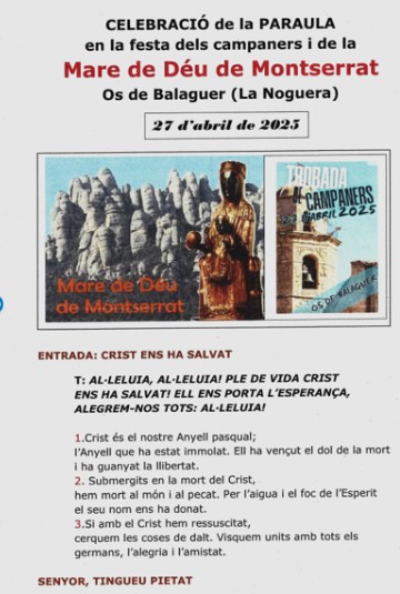 A la diada de la Mare de Deu de Montserrat, el passat 27 d’abri 2025l, vàrem participar a la Trobada de Campaners que, cada any, es celebra a Os de Balaguer, un racó de la Noguera, que acull una serie d’activitats relacionades amb les campanes, i es motiu de trobada d’un bon nombre de campaners : uns en actiu, d’altres per retrobar-se amb companys i coneguts i també visitants esporàdics, per gaudir d’aquest indret encerclat de muntanyes.