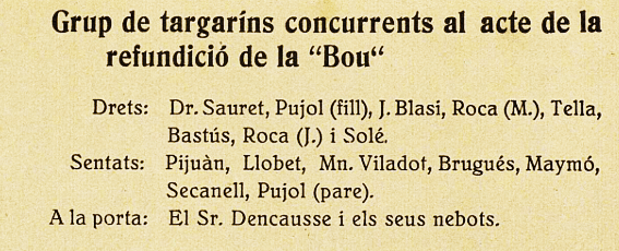 El setmanari ” Vida Nova ” va oferir a l’edició del 20 d’abril de 1922 (núm. 3), una fotografia dels representants targarins que assistiren a la fosa de la campana “La Bou”; aquesta inserció gràfica ens ajuda a recuperar aquell moment.
