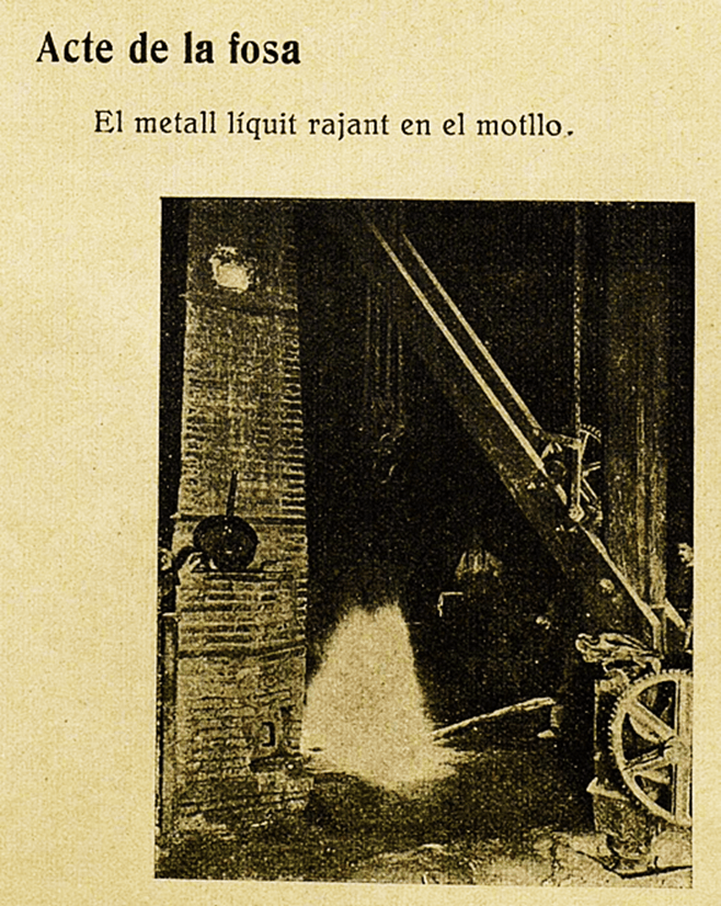 La fotografia correspon al moment de la fosa, amb el metall liquid; es pot endevinar un operari al darrera, una grua amb cadenes, una corriola, i una columna de rajola d’obra vista, que podria ser una xemeneia del forn.