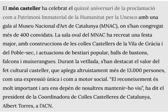 Més enllà d’aquesta crida a una reflexió dels representants que varen ser escollits per a gestionar l’entitat, també hi ha un cert desànim; potser podeu pensar que son “cabòries” meves però, en aquestes dies, altres manifestacions culturals (reconegudes per la Unesco, com la nostra), han sortit al carrer a fer palesa la identitat del que fan : els Castellers i la Patum de Berga. Uns, i altres, són manifestacions de territori però, malgrat que tinguin reconeixements diferenciats, si que podem extreure’n alguna vivència.