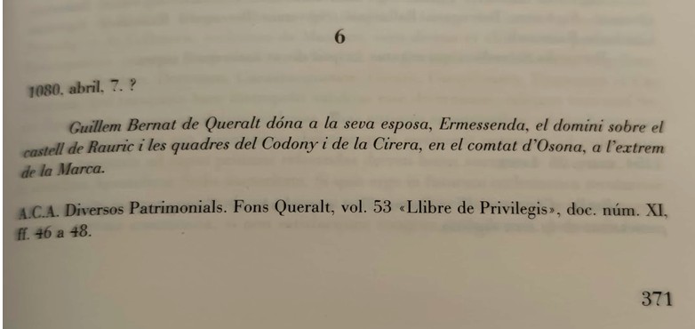 El document esmentat a l’inici, es troba a la pàgina 371, annex 6: “Guillem Bernat de Queralt dona a la seva esposa, Ermessenda, el domini sobre el castell de Rauric i les quadres del Codony, i de la Cirera, en el comtat d’Osona, a l’extrem de la marca – 7 abril de 1080”