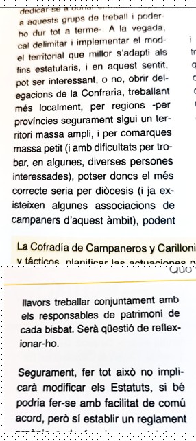 Recupero del “Batall” número 24 de l’any 2018, un fragment, del llavors Secretari de la Confraria Ramón Gene, que amb el nom de “Quo Vadis Confraria” (pàgines 26 a 2 feia un repàs de projectes, i propostes, que es podrien desenvolupar a la Confraria, i reprodueixo unes línies del mateix on s’esmenta la possibilitat de territorialitzar l’entitat amb seccions més petites, o que aquestes tinguessin l’extensió de les actuals diòcesis per poder mantenir una vinculació més directa, amb els responsables de Patrimoni de cada Bisbat.