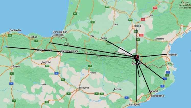 Revisant el mapa adjunt es pot veure que, en un recorregut per la serralada pirenenca, hi ha Tarbes, Tolosa o Perpignan, i per part espanyola el fonedor Portilla (Cantabria), els campaners vascos i navarressos, Os de Balaguer (referent de les trobades), Cervera, Barcelona o Montblanc, entre d’altres indrets, tots ells relativament propers.